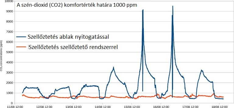 (Az átszellőztetés után 1-2 óráig megfelelő a házban a levegő. 1000 ppm CO2 felett azonban romlik a koncentráló képesség, kevésbé pihentető az alvás és fejfájást is okozhat a rossz levegő)